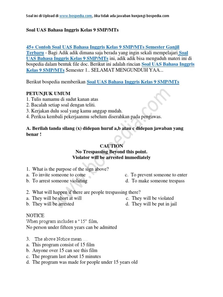 Soal uts bahasa inggris k13 kelas 9 semester 1 (gasal) tahun 2020 / 2021. Pada kesempatan kali ini akan kamibagikan contoh latihan soal mid / uts / ulangan tengah semester 1 (ganjil) kelas 9 / ix smp / mtsmapel bahasa inggris. Pada kesempatan kali ini akan bapak bagikan contoh latihan soal uas semester 2 / genap kelas 9 / ix smp / mts mapel bahasa inggris. 20 contoh soal uas bahasa inggris kelas 9 smpmts semester genap . Download soal pas/uas bahasa inggris kelas 9 smp/mts semester 1 (ganjil/gasal) beserta kunci jawaban kurikulum 2013 (k13) revisi 2018 tahun .
